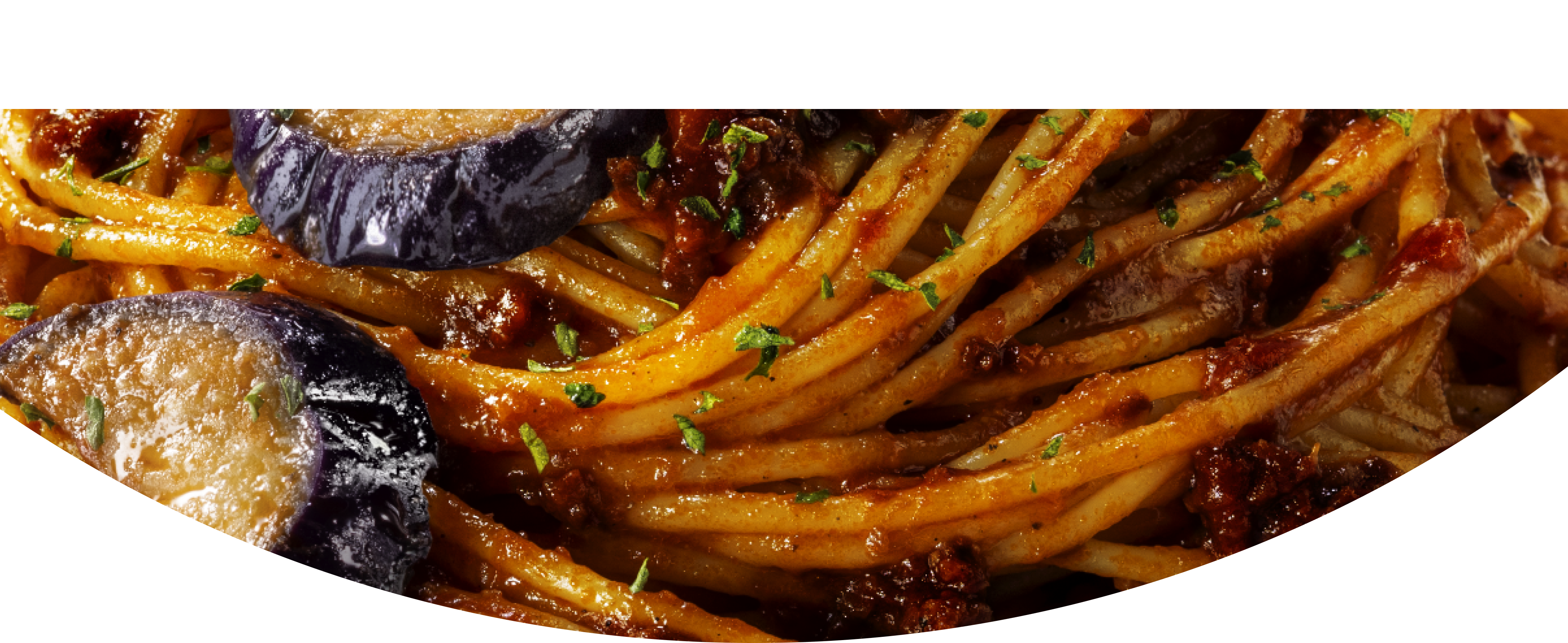 牛挽肉とトマトをじっくり煮込み、赤ワインで仕上げた本格的なボロネーゼソースにアルデンテ食感の厳選イタリア産スパゲティが相性抜群。ごろっと揚げなす、パセリ入り。